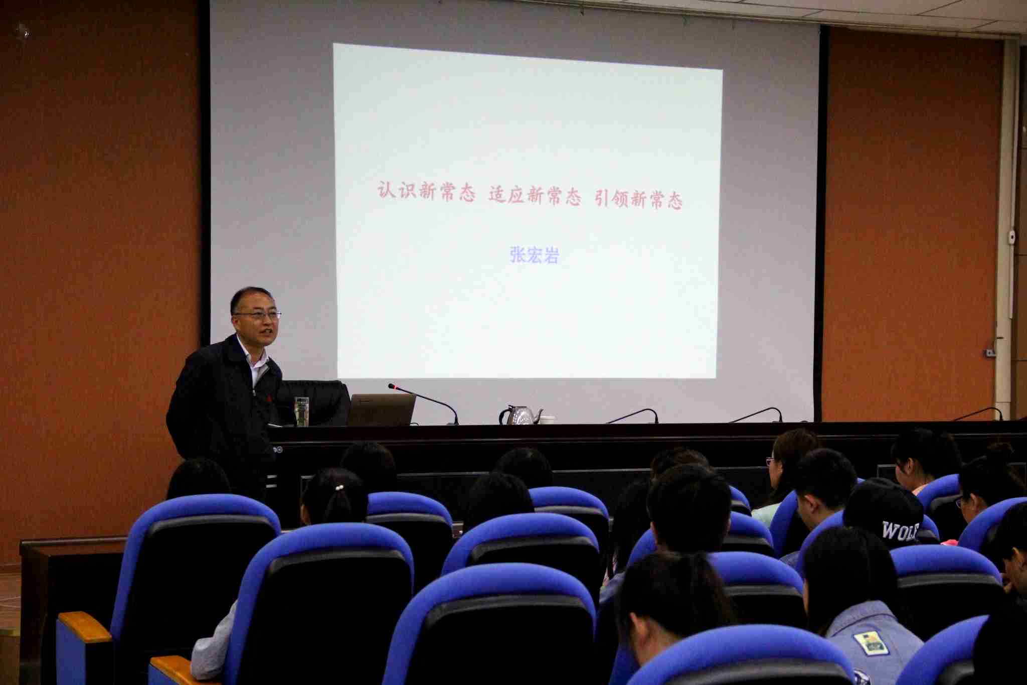 张宏岩书记从“认识新常态”、“适应新常态”、“引领新常态”以及“我们怎么办?”四个方面进行了认真细致的讲解,在授课过程中,运用了历史文献、经典语录、照片、图表等大量的资料,讲解脉络清晰、内容翔实、语言生动,使同学们对“新常态”有了深刻的认识和理解。张书记希望同学们要正确地认识中国经济的新常态与新动力,坚定对中国经济发展的信心,努力学习专业知识,全面提高综合素质,为国家经济、社会发展做出更大贡献。