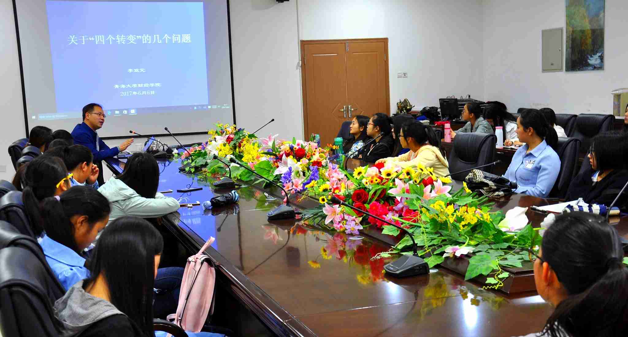 李双元院长从 “四个转变是什么”、“四个转变提出的时代背景和重大意义”、“四个转变”的内涵”、“四个转变的逻辑关系”和“我们应该做什么”五个方面阐释了省十二届十三次全委会提出的“四个转变”新思路。在讲解中,李院长强调“四个转变”是中共青海省委为全面落实“四个扎扎实实”重大要求的方法路径。希望全院师生在今后的工作、学习中,充分认识“四个转变”的重要意义,切实把思想和行动统一到党代会精神上来;希望同学们养成良好品质,树立远大理想;全面提升素质,实现自己梦想。