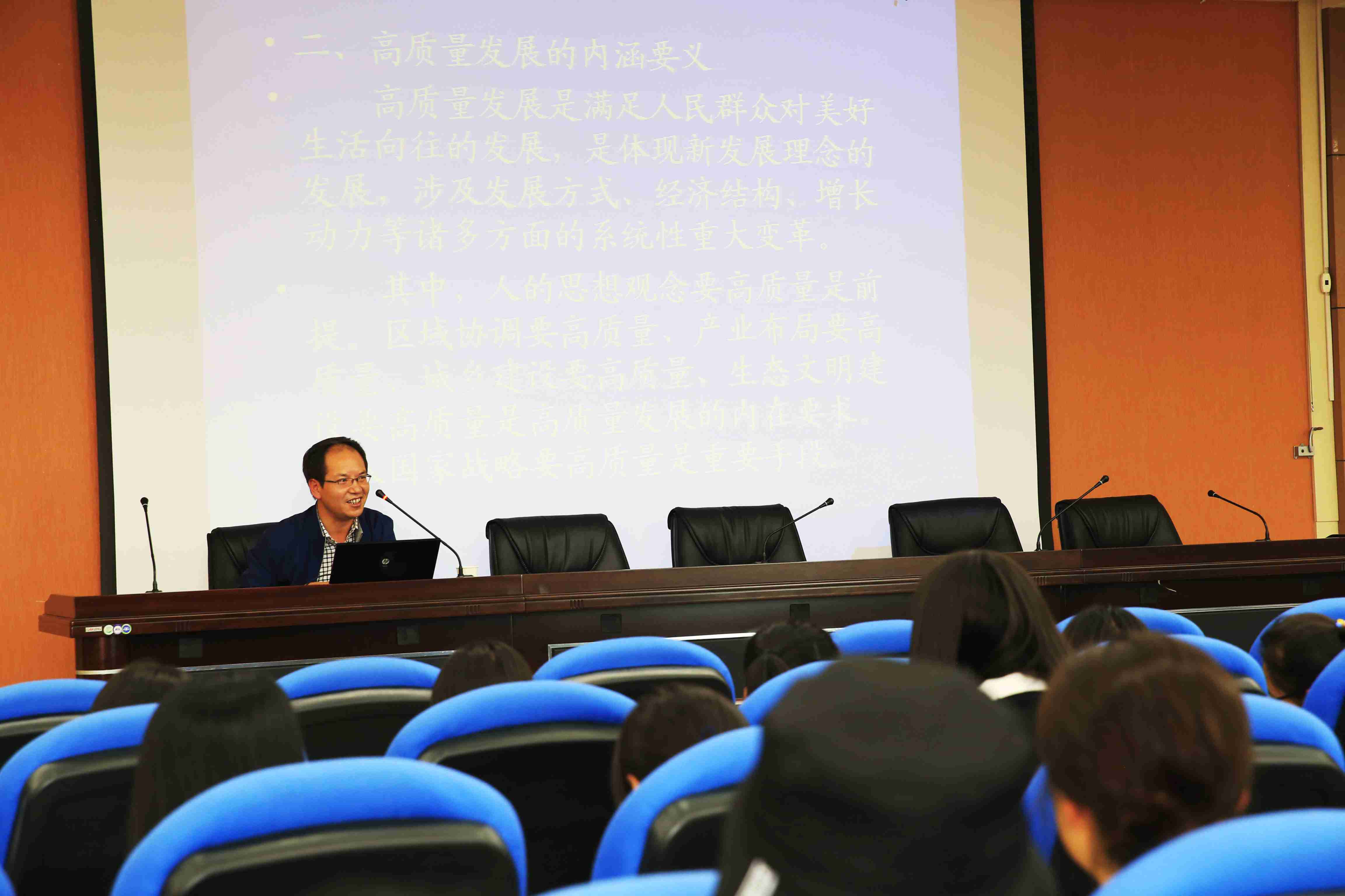 李双元院长做了《推动高质量发展的内涵要义和着力点》,对省委十三届四次全会精神从关于会议的主要成果、关于深化对省情的认识和把握、关于生态保护优先 、关于推动高质量发展 、关于创造高品质生活 、关于全面落实新时代青海党的建设总要求等六个方面对这次全会进行了解读。他强调,这次全会是一次高举旗帜、维护核心的重要会议,是一次深化认识、谋划未来的重要会议,是一次鼓舞斗志、激发作为的重要会议,对在新时代新起点上决胜全面建成小康社会,奋力书写富裕文明和谐美丽新青海的美好画卷具有重大而深远的意义。寄予同学们,你们是国家未来发展的主要力量,十九大和省委十三届四次全会所描绘的未来蓝图等候你们去分享,人生只有融入国家和民族的伟大事业才能闪闪发光。希望同学们认清自己的历史使命,明确成才的目标,确立为国家、为民族奋斗的志向,为绿色校园和美丽中国贡献自己的力量。